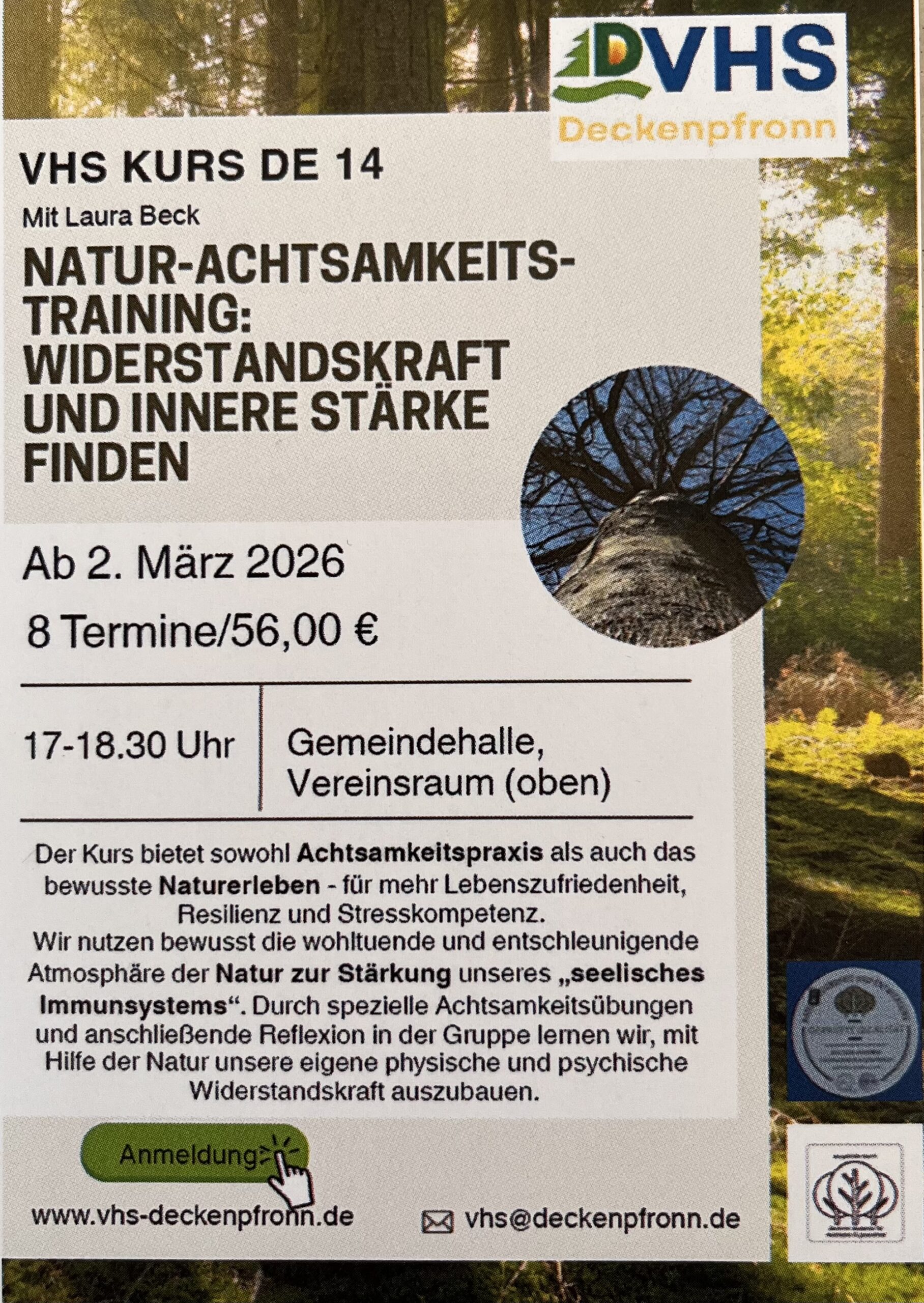 Der Kurs findet 8x Mal in der Gemeindehalle Deckenpfronn (75392), im Vereinsraum (oben) statt.